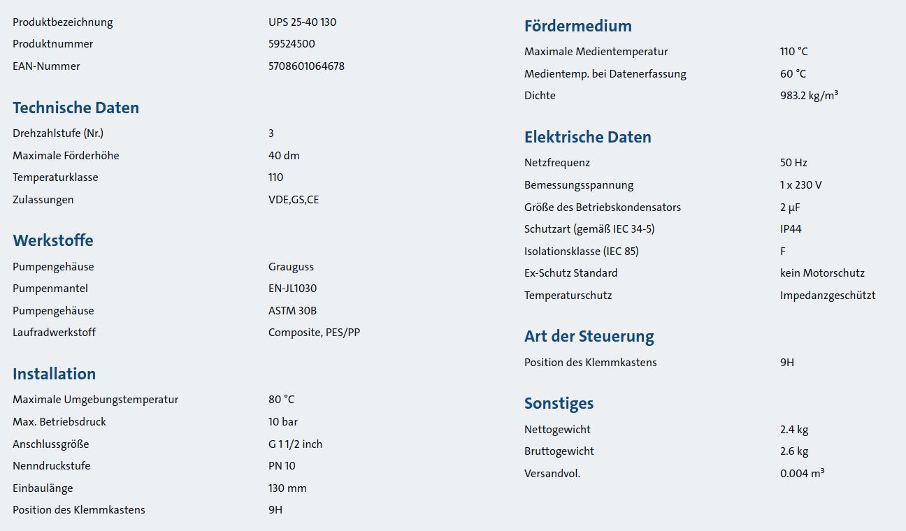 Produktinformationen "Grundfos UPS 25 - 40 130mm Baulänge Heizungspumpe Umwälzpumpe 59524500"